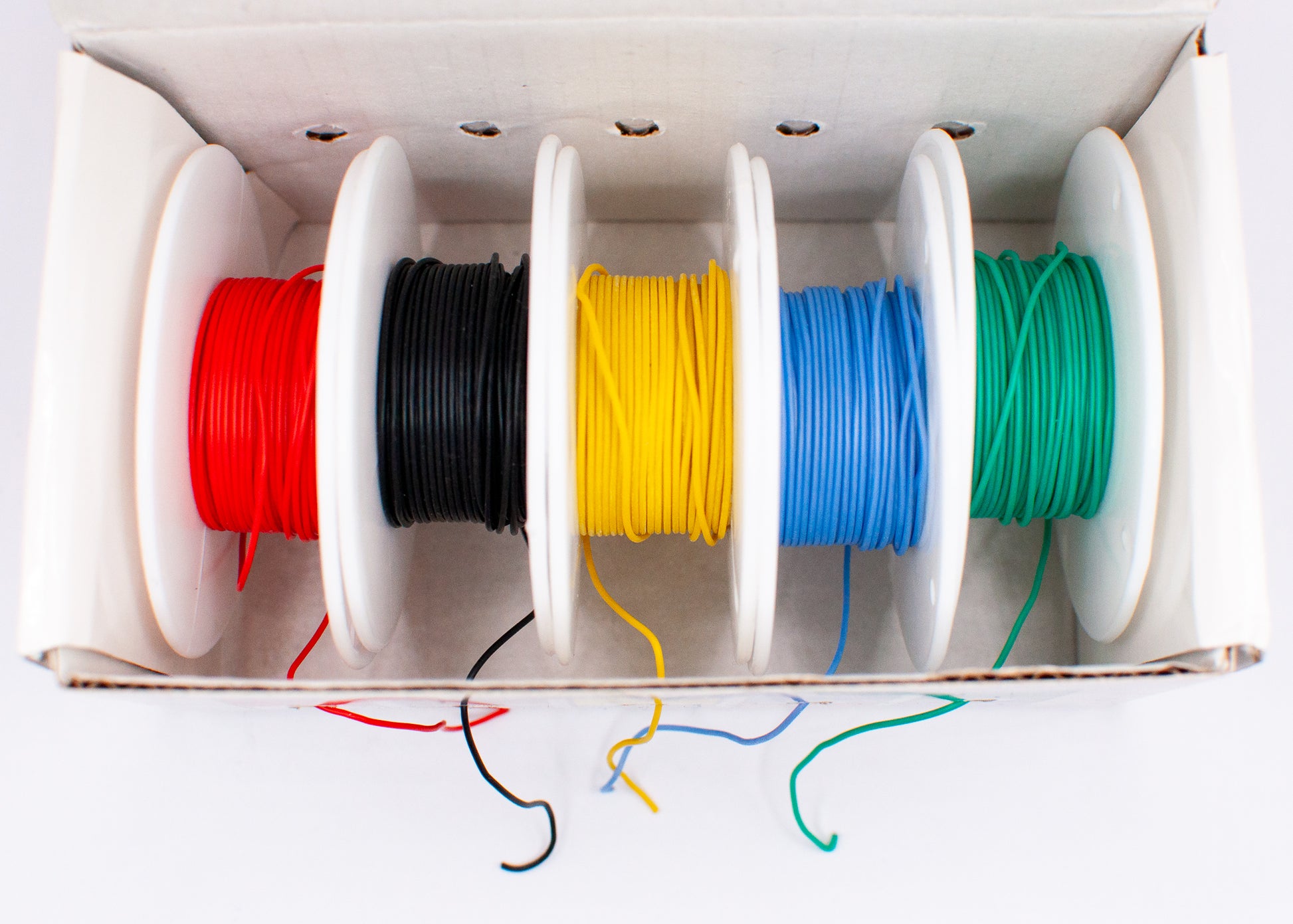 A set of silicone wires in 5 colors, suitable for soldering applications. Each spool contains 10 m of wire.